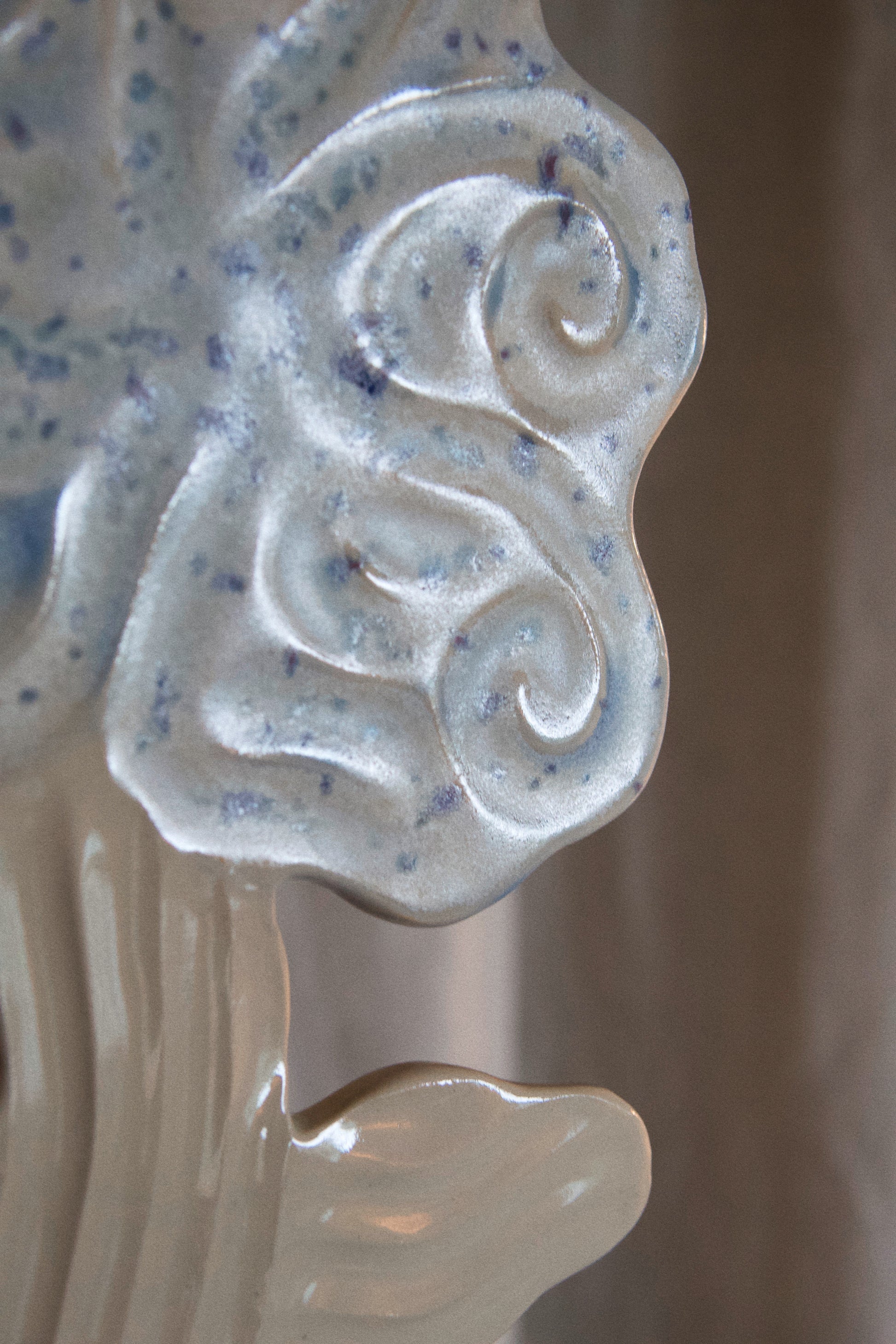 A ceramic flower in a white stoneware clay, glazed in a shiny transparent and white glaze with blue speckles.