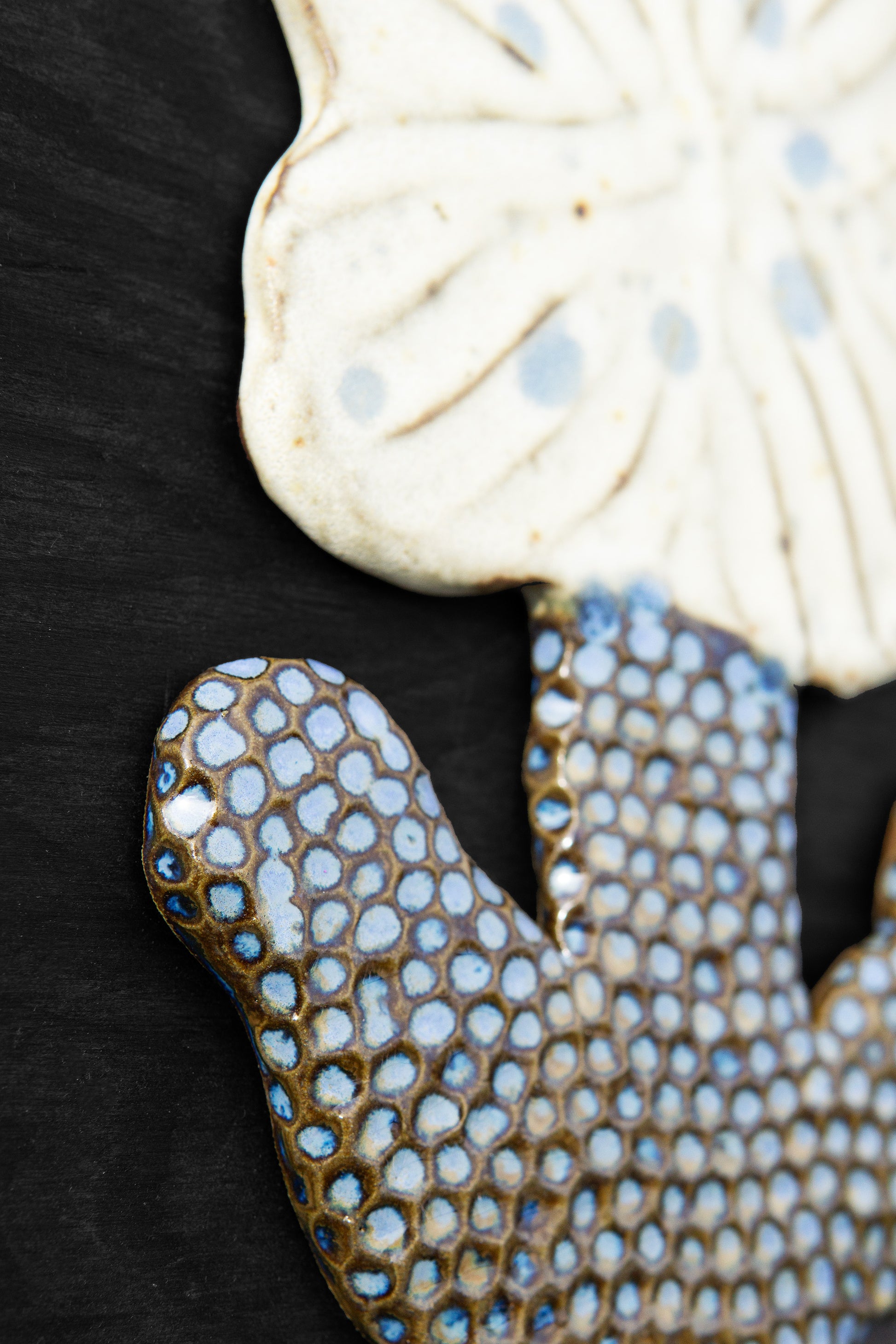 A ceramic flower in a stoneware clay, glazed in a shiny blue and white matte glaze with blue dots.