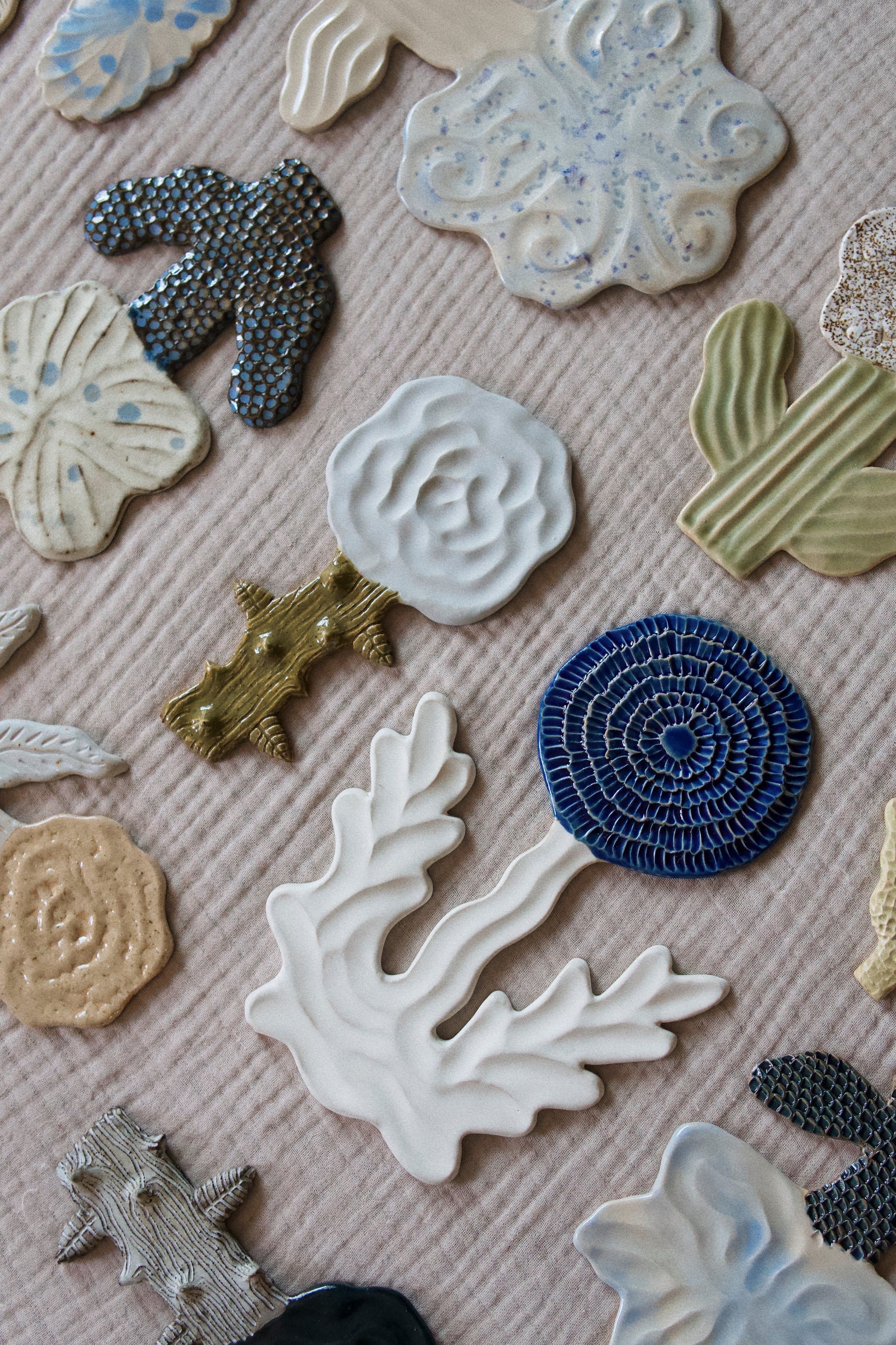 A ceramic flower in a stoneware clay, glazed in a shiny blue and white glaze with blue brush strokes.