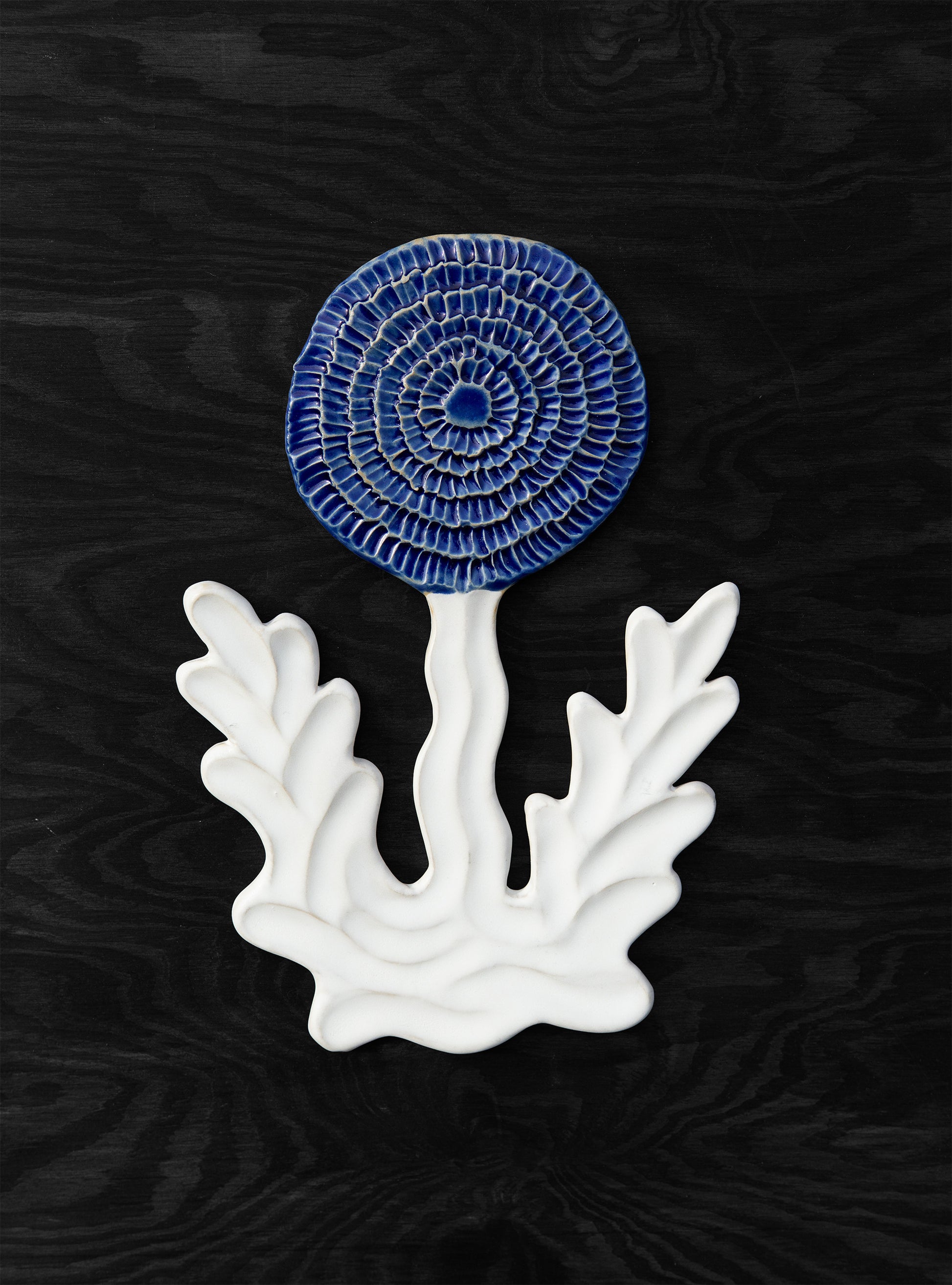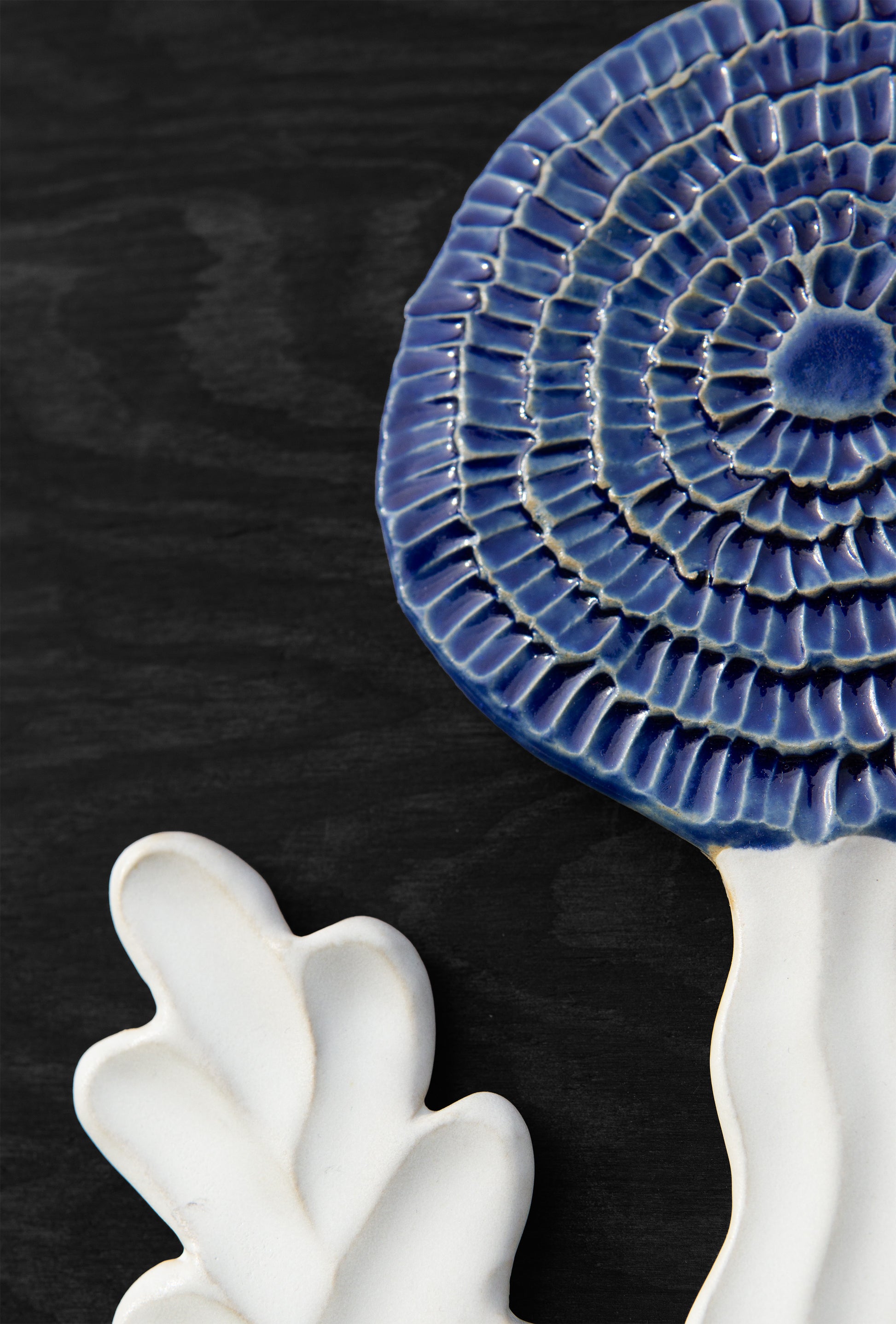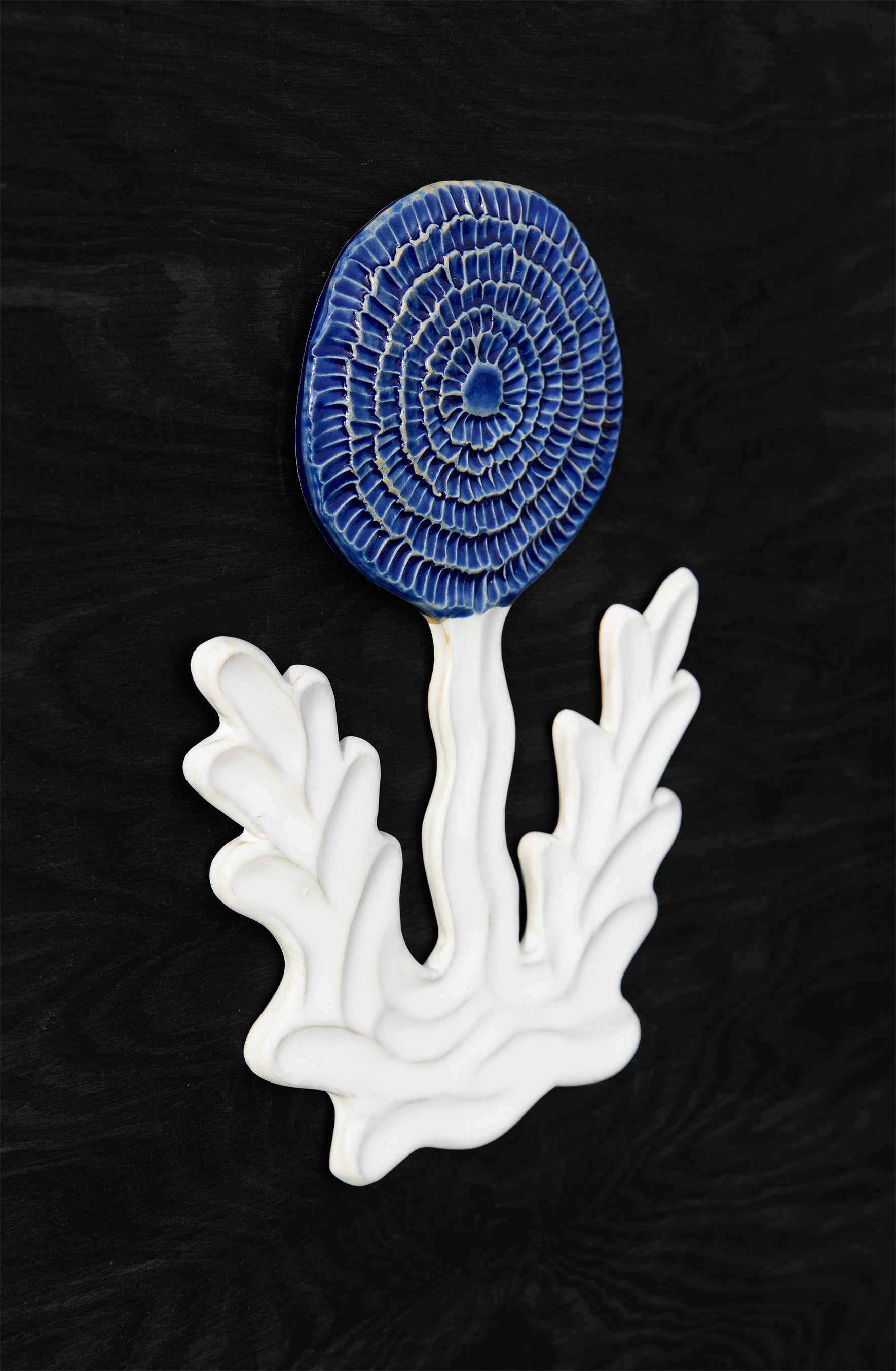 A ceramic dandelion in a white stoneware clay, glazed in a shiny blue and white matte glaze.