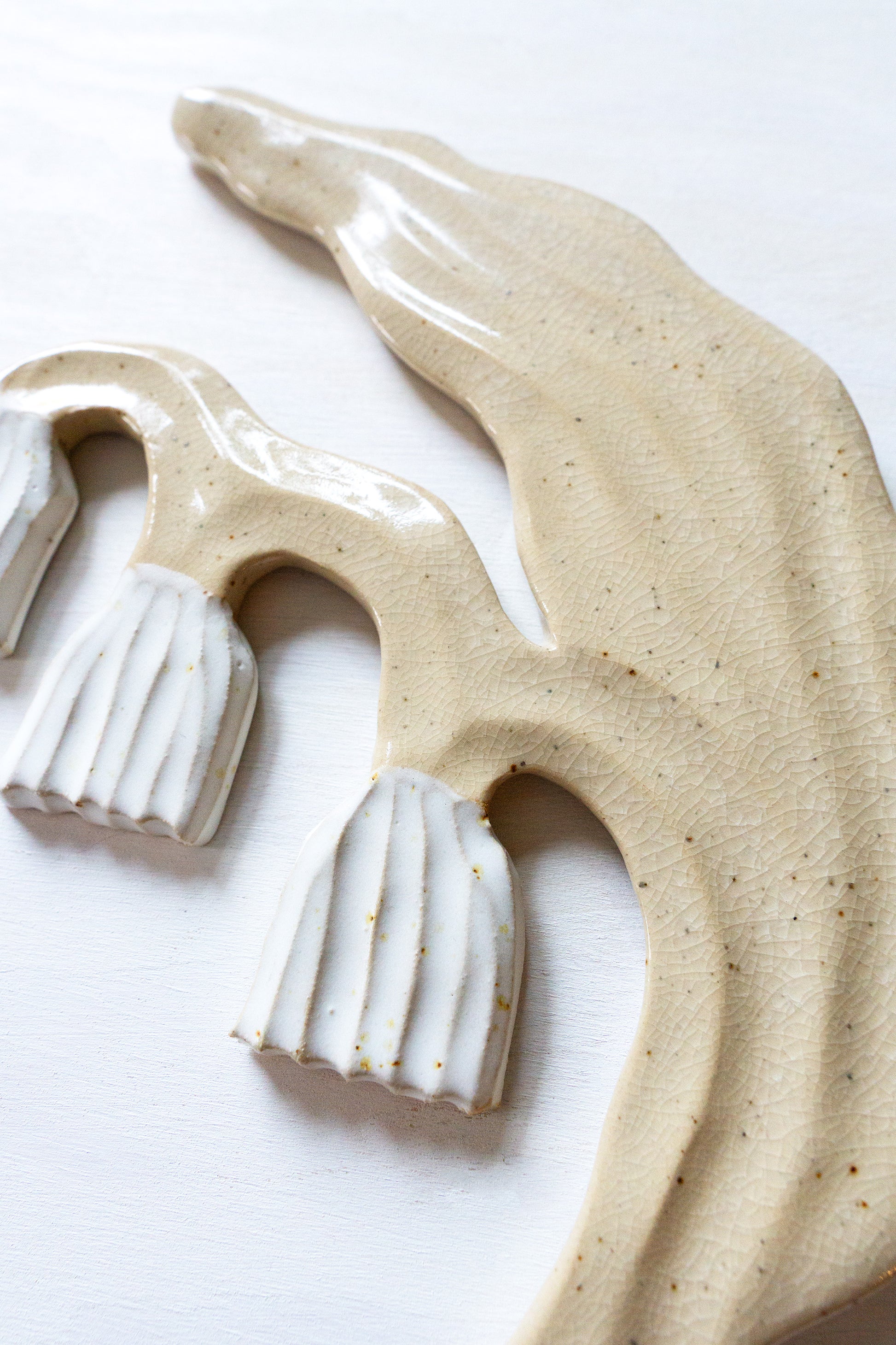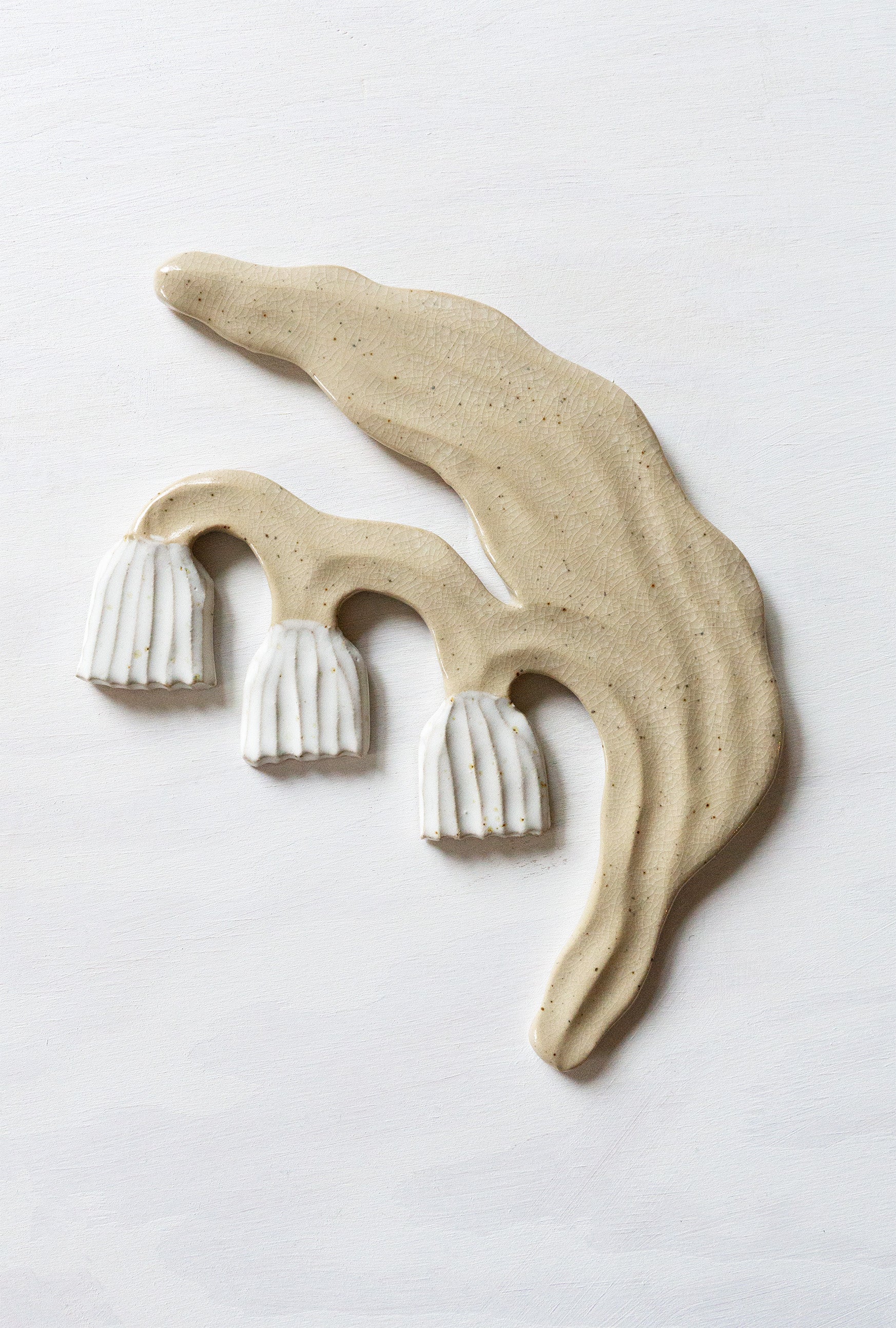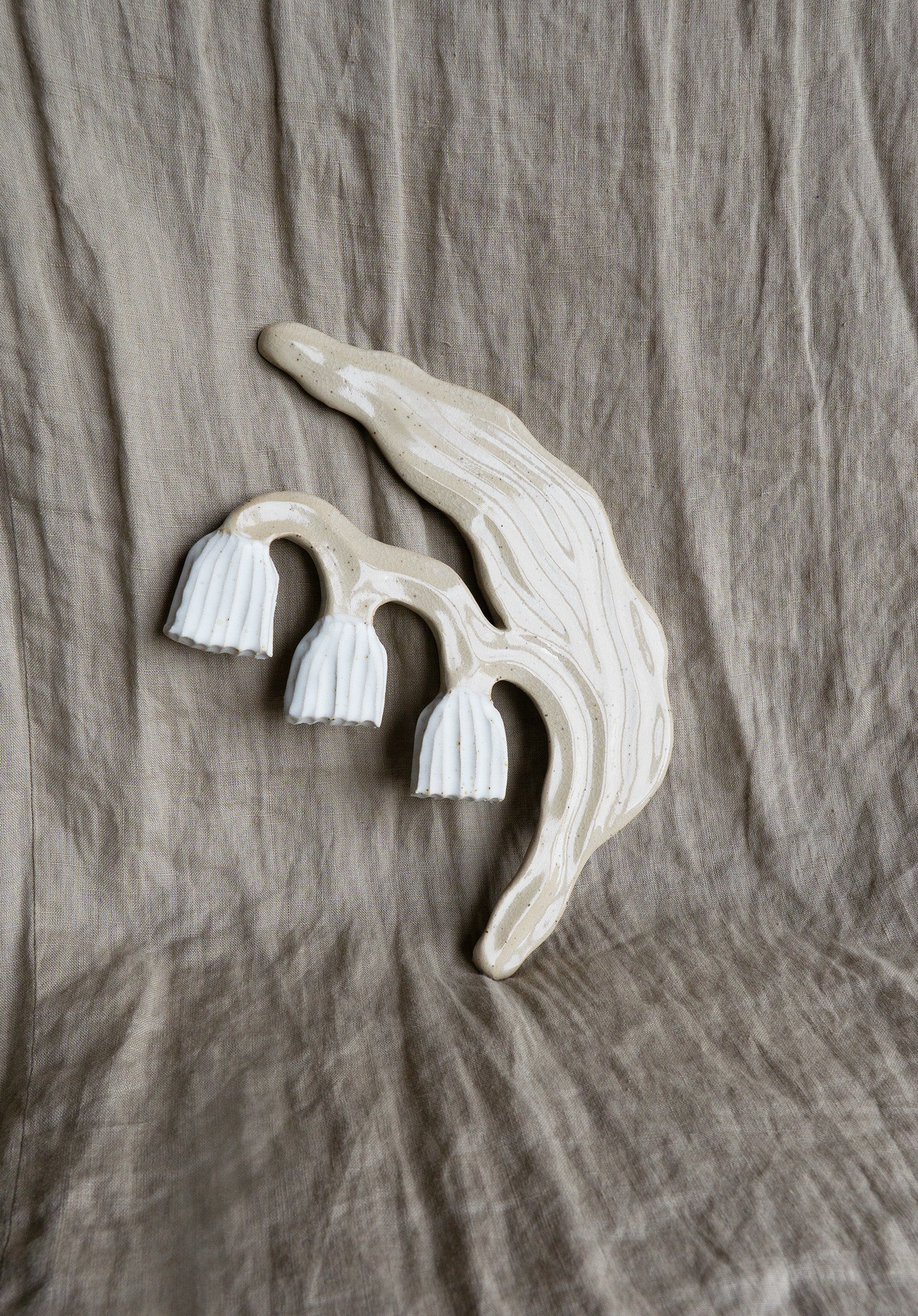 A ceramic flower in a spotted stoneware clay, glazed in a shiny cracked and matte white glaze.