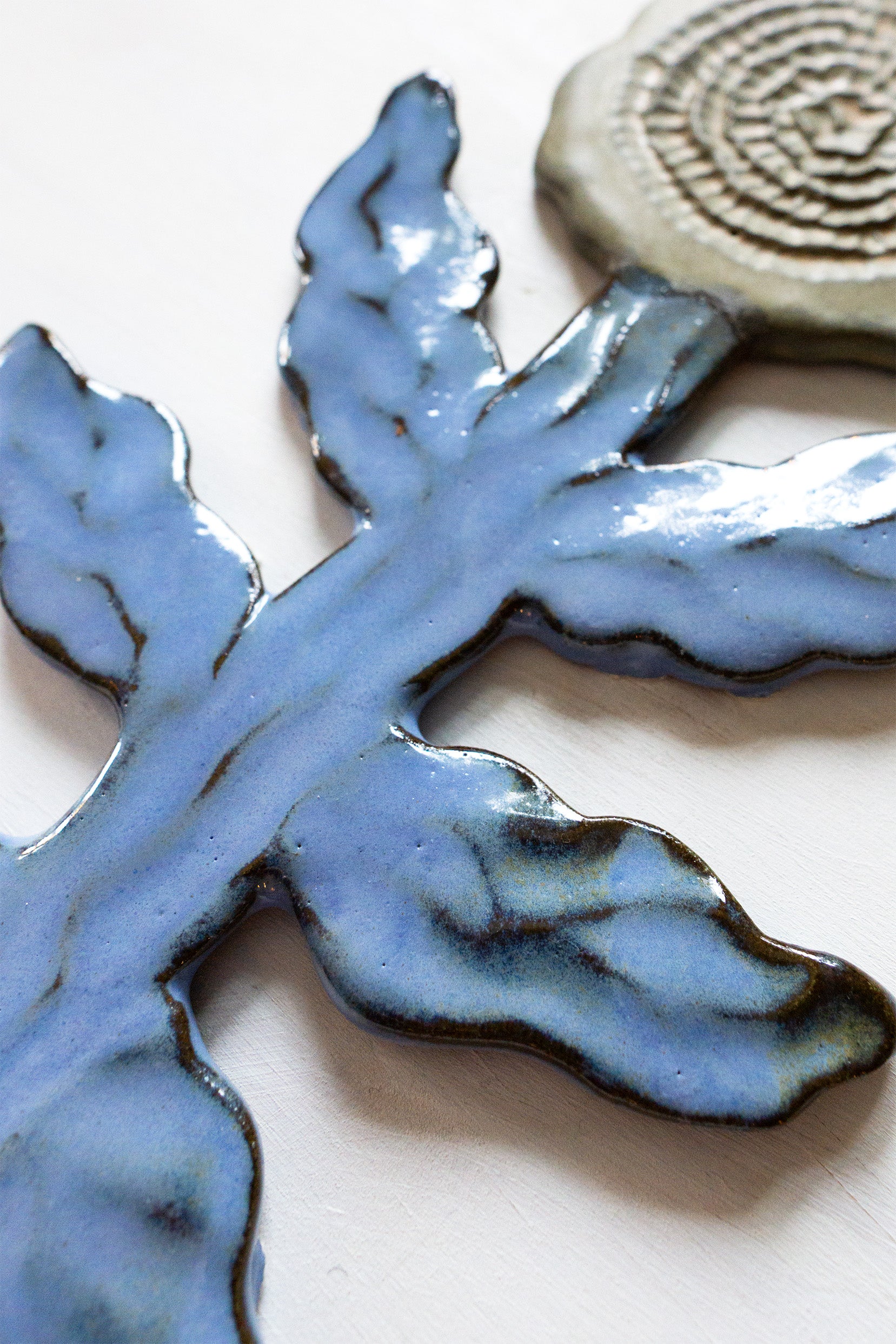 A ceramic flower in a dark stoneware clay, with shiny blue and matte beige glazes.